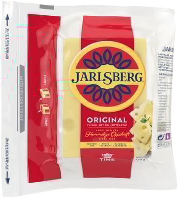 Jarlsberg® er verdenskjent for sin fyldige, litt søtlige og nøtteaktige smak og sine store hull. Osten med den hemmelige ingrediensen har vært laget av TINE siden slutten av 50'tallet. Osten er pakket i en praktisk pose som bevarer den gode smaken. Jarlsberg® løfter smaken - på brødskiva, så vel som i kalde og varme retter. Prøv den på pizza, pai, omeletter eller i salater. Som de fleste faste hvite oster er Jarlsberg® laktosefri.
