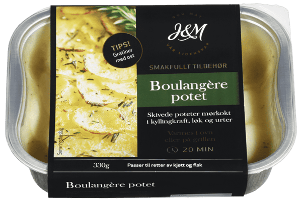 J&M Boulangère Potet 330g fra J&M Produktet er tilgjengelig hos Coop til en pris av 29.90 kr. Produktet leveres av MATPARTNER AS. Produktet ble første gang registrert 9.1.2022 og sist oppdatert 16.7.2023. Prisen har holdt seg stabil på 29.90 kr.