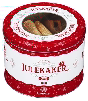 Krumkaker: hvetemel, egg, sukker, klaret meierismør, rapsolje, fløte, melk, vaniljeessens, salt, kardemomme. goro: egg, hvetemel, sukker, klaret meierismør, rapsolje, potetmel, fløte, melk, konjakk, vaniljeessens, salt, kardemomme. berlinerkranser: hvetemel, sukker, usaltet meierismør, margarin (rapsolje, fullherdet kokos- og rapsolje, vann, kokosolje, salt, emulgator (e471), vitamin a og d, farge (e160a), aroma), eggeplomme, emulgator (e322- soyalecitin). topping: perlesukker. serinakaker: hvetemel, sukker, usaltet smør, margarin (rapsolje, fullherdet kokos- og rapsolje, vann, kokosolje, salt, emulgator (e471), vitamin a og d, farge (e160a), aroma), egg, hevemiddel (e450, e500), romessens, vaniljeessens, emulgator (e322-soyalecitin). topping: hakkede mandler, perlesukker. bordstabels: hvetemel, sukker, usaltet meierismør, margarin (rapsolje, fullherdet kokos- og rapsolje, vann, kokosolje, salt, emulgator (e471), vitamin a og d, farge (e160a), aroma), egg, fløte, vaniljeessens, emulgator (e322-soyalecitin). topping: mandler, melis, eggehvite.Prosesseringsanalyse