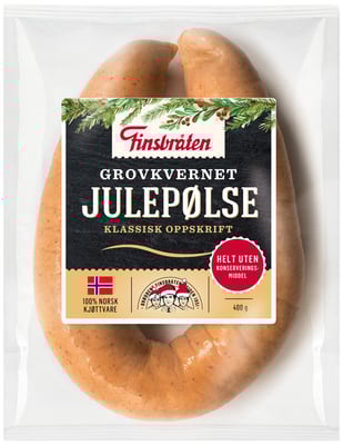 Julepølse Grov 400g Finsbråten fra Finsbråten Produktet er tilgjengelig hos Meny til en pris av 65.90 kr. Produktet leveres av Finsbråten a/s. Produktet ble første gang registrert 17.11.2022 og sist oppdatert 16.7.2023. Prisen har holdt seg stabil på 65.90 kr.