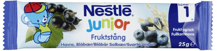 Nestlé Junior Fruktstang er et godt mellommåltid med frukt, bær og fullkorn. Fruktstangen er spesielt tilpasset barn over 1 år og inneholder jern og kalsium. Den har en myk konsistens og en tilpasset størrelse så barnet kan spise selv. Fruktstangen er perfekt å ta med på utflukter og andre aktiviteter der barnet ditt trenger litt ekstra energi.