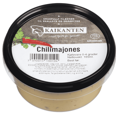 Kaikanten Chilimajones 165ml fra KAIKANTEN er et produkt innen Pålegg & frokost, Majones. Produktet er tilgjengelig hos Coop til en pris av 37.90 kr. Produktet inneholder følgende allergener: Egg, Sennep. Produktet leveres av KAIKANTEN DELIKATESSER AS. Produktet ble første gang registrert 9.1.2022 og sist oppdatert 16.7.2023. Prisen har holdt seg stabil på 37.90 kr.