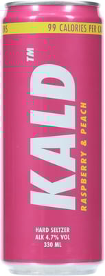 KALD Hard Seltzer er naturlig smaksatt vann med kullsyre og alkohol. Med en mild smak av fersken og modne bringebær, så får du en lettdrikkelig og forfriskende drink. 4.7% alkohol, kun 99 kalorier per boks, og glutenfritt.