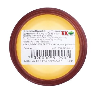 Karamellpudding 100g Ek fra Ek er et produkt innen Dessert, Dessertpuddinger, Karamellpudding. Produktet er tilgjengelig hos Meny til en pris av 17.90 kr. Produktet inneholder følgende allergener: Egg, Melk. Produktet leveres av Ek gårdspakkeri as. Produktet ble første gang registrert 11.6.2023 og sist oppdatert 14.3.2026. Prisen har holdt seg stabil på 17.90 kr.