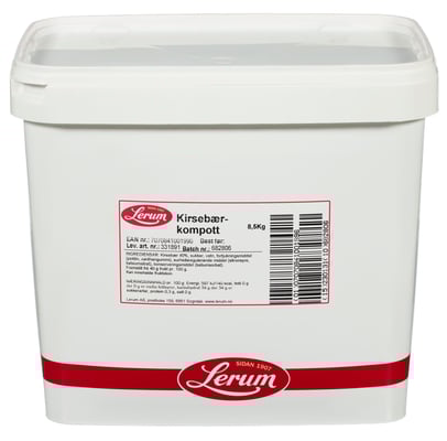 Kirsebærkompott 8,5 kg Lerum fra Lerum Vekten er 8.5 kg. Produktet leveres av LERUM AS. Produktet ble første gang registrert 11.6.2023 og sist oppdatert 6.9.2023.