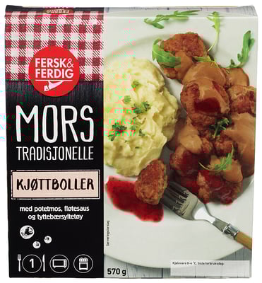 Potetmos 35 % [potet 78 %, fløte (inkl. emulgator e472e, stabilisator (e412, e415)), vann, margarin (rapsolje, fullherdet kokos- og rapsolje, vann, kokosolje, skummetmelk, salt, emulgator (e322/soyalecitin, e471), aroma), salt, dekstrose, sukker, muskat, løk, gjærekstrakt, krydderekstrakter, selleri, aroma, hvit pepper, koriander, fennikel], kjøttboller 32 % [storfekjøtt 62 %, vann, svinekjøtt, potetmel, krydderblanding (løk, melkeprotein, bambusfiber, hvit pepper, ingefær), bambusfiber, havrefiber (havrefiber, inulin, psyllium, maltodektrin, potetfiber), salt, mineraltsalt (e508, e511)), allehånde], fløtesaus 27 % [vann, fløte (inkl. emulgator e472e, stabilisator (e412, e415)), modifisert maisstivelse, eddik, fond (oksebuljong, vann, salt, aroma, sukker, modifisert stivelse, løk, eddik, krydder, stabilisator e415), tomat, sukker, fargestoff e150d, sennep (vann, sennepsfrø, sukker, eddik, salt, krydder), salt, dekstrose, gjærekstrakt, krydderekstrakter, hvit pepper, selleri, løk, muskat], tyttebærsyltetøy 5 % [tyttebær 40 %, sukker, vann, fortykningsmiddel e440b, surhetsregulerende middel e330, konserveringsmiddel e211]. pakket i beskyttende atmosfære.
