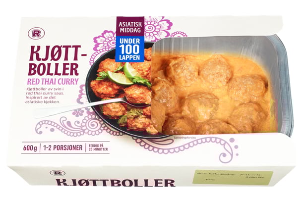 Kjøttboller (herav 82 % hakket svinekjøtt*, vann, tapiokastivelse, dekstrose (av mais),