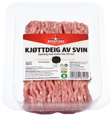 Kjøttdeig av Svin 8% 400g Vekten er 400 g. Produktet leveres av NORDFJORD KJØTT. Produktet ble første gang registrert 11.6.2023 og sist oppdatert 6.9.2023.