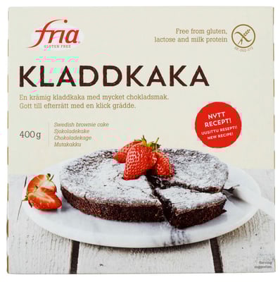 Glutenfri kladdake som passer perfekt både til hverdag og til fest! Den er akkurat passe klebrig, og har en herlig duft av kakao og vanilje. Kladdkaken fryses ned direkte etter steking. På den måten holder den seg fersk i lengre tid. Kaken kan med fordel skjæres når den er fryst, om man ikke vil ta ut hele kaken fra fryseren. Både hel kladdkake og oppskårne biter, tiner raskt i romtemperatur. Fri for gluten-, laktose- og melkeprotein.