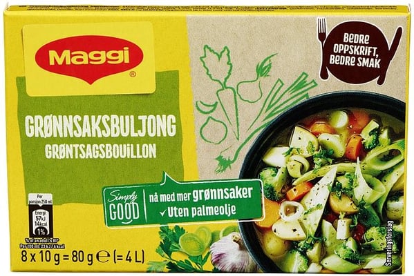 Klar Grønnsakbuljong 5 l fra Maggi er et produkt innen Middagstilbehør, Kraft og buljong, Buljong. Produktet er tilgjengelig hos Oda til en pris av 17.70 kr. Vekten er 5 l. Produktet leveres av AS Nestlé Norge. Produktet ble første gang registrert 9.1.2022 og sist oppdatert 7.10.2023. Prisen har holdt seg stabil på 17.70 kr.