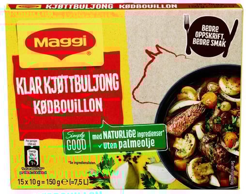 Klar kjøttbuljong Terninger, 7,5 l fra Maggi er et produkt innen Middagstilbehør, Kraft og buljong, Buljong. Produktet er tilgjengelig hos Oda til en pris av 29.30 kr. Vekten er 7 l. Produktet leveres av AS Nestlé Norge. Produktet ble første gang registrert 9.1.2022 og sist oppdatert 7.10.2023. Prisen har holdt seg stabil på 29.30 kr.