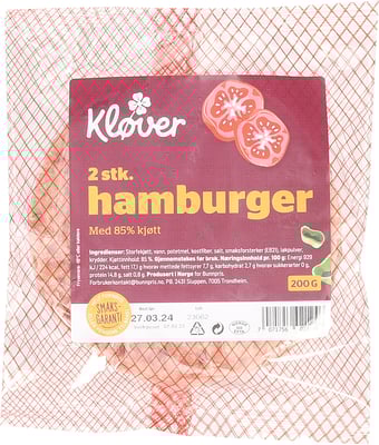 Kløver Hamburger Rå 85% 200g Fr fra Kløver Vekten er 200 g. Produktet leveres av EDELGARD AS. Produktet ble første gang registrert 11.6.2023 og sist oppdatert 6.9.2023.