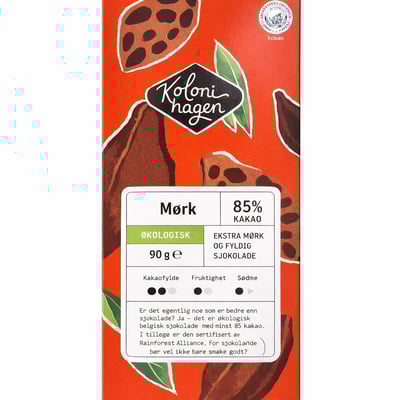 Økologisk mørk sjokolade minst 85 % kakao fra København Vekten er 90 g. Produktet leveres av REMA 1000 AS. Produktet ble første gang registrert 28.3.2026 og sist oppdatert 28.3.2026.