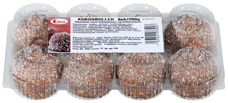 Kokosboller 8pk 200g Vekten er 0.2 kg. Produktet inneholder følgende allergener: Egg. Produktet leveres av CALAS AS. Produktet ble første gang registrert 11.6.2023 og sist oppdatert 6.9.2023.
