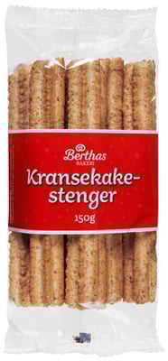 Kransekakestenger 150g Berthas fra Berthas er et produkt innen Bakeri, Kaker, Kransekake. Produktet er tilgjengelig hos SPAR til en pris av 42.90 kr. Produktet inneholder følgende allergener: Egg, Nøtter. Produktet leveres av Baxt as. Produktet ble første gang registrert 15.11.2022 og sist oppdatert 3.8.2023. Prisen har holdt seg stabil på 42.90 kr.