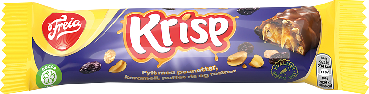 Krisp 48g Freia fra Freia Produktet er tilgjengelig hos Joker til en pris av 18.90 kr. Produktet inneholder følgende allergener: Gluten, Melk, Peanøtter, Soya. Produktet leveres av Mondelez norge as. Produktet ble første gang registrert 9.1.2022 og sist oppdatert 16.7.2023. Prisen har endret seg fra 18.50 kr til 18.90 kr over tid.