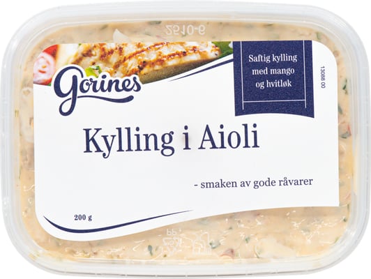 Kylling i Aioli 200g Gorines fra Gorines AS¤Gorines er et produkt innen Pålegg & frokost, Påleggsalat. Vekten er 200 g. Produktet inneholder følgende allergener: Egg, Sennep. Produktet leveres av SPESIALGROSSISTEN AS. Produktet ble første gang registrert 11.6.2023 og sist oppdatert 6.9.2023.