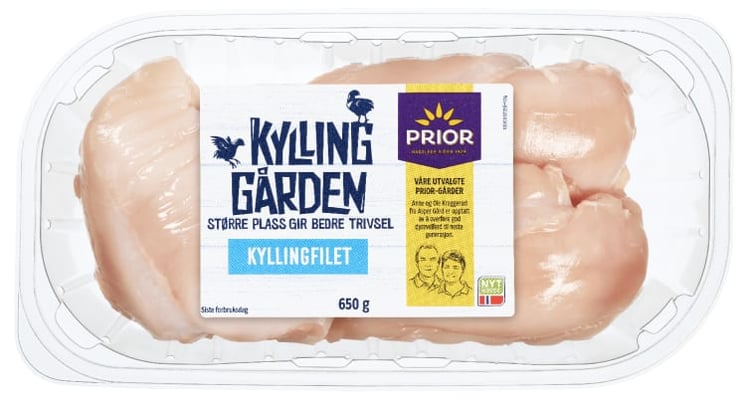 Ferske kyllingfileter fra utvalgte Prior-gårder i Norge. Her får kyllingene fôr uten narasin og det brukes ikke antibiotika i produksjonen. I tillegg er det i kyllinghusene satt inn elementer som bidrar til økt aktivitet og trivsel.