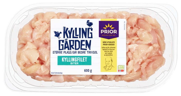 Biter av fersk kyllingfilet fra utvalgte Prior-gårder i Norge. Her får kyllingene fôr uten narasin og det brukes ikke antibiotika i produksjonen. I tillegg er det i kyllinghusene satt inn elementer som bidrar til økt aktivitet og trivsel.