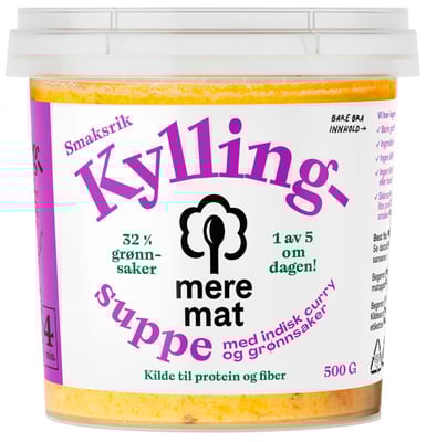 Fersk og smakfull suppe med bare bra innhold! En indiskinspirert, spicy kyllingsuppe med 32% grønnsaker, hjemmelaget curry og kokosmelk. Suppen inneholder 32 % grønnsaker, og dekker 1 av 5 om dagen i forhold til anbefalt inntak. Gluten- og melkefri, og helt uten tilsetningsstoffer og stabilisatorer. Kilde til protein og fiber.