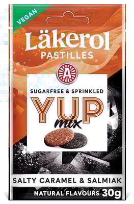 Läkerol YUP Mix Salty Caramel & Salmiak er en populær blanding av søt karamellfudge og salt lakris. Et tynt lag med xylitol-krystaller gir en frisk følelse i munnen. Pastillen er både sukkerfri, vegansk og palmeoljefri.