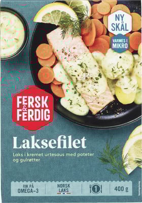 En ferdig tradisjonell middagsrett med laks, poteter, gulrøtter og en mild og god urtesaus. Rask og enkel middag. Varmes i micro.
