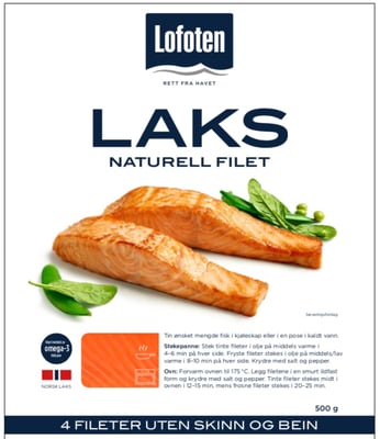 Lofoten Laks naturell er 4 dypfryste fileter uten skinn og bein, av fersk, norsk oppdrettslaks. Fisken har et naturlig høyt innhold av omega-3-fettsyrer.