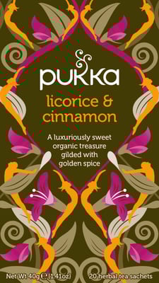 Pukka Licorice & Cinnamon Urte-te er en te som kombinerer den rene. søte smaken av lakrisrot. med den varmende effekten av kanel og kakaobønner. 100% økologisk