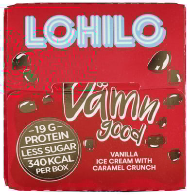 En smakfull vaniljeis med knasende karamellkuler. Hele boksen inneholder kun 340 kalorier, 19 gram protein, mindre sukker og er i tillegg laktoseredusert.