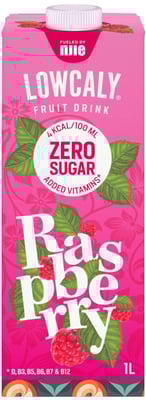 Lowcaly Raspberry - en sukkerfri fruktdrikk med bringebærsmak og tilsatt vitaminer.