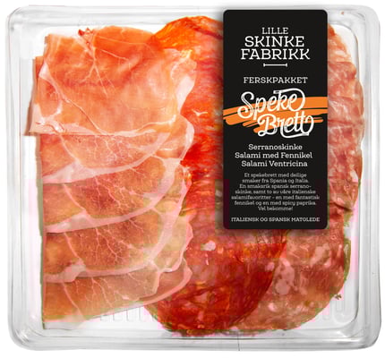 Ventricina (Kjøtt av svin (opprinnelsesland Italia), chili pepper pasta (3,5%), salt, skummetMELKpulver, naturlig aroma, dekstrose, antioksidant (E301, E300), konserveringsmiddel (E252, E250)) Fenikkelsalami (Kjøtt av svin (opprinnelsesland Italia), salt, skummetMELKpulver, dekstrose, fenikkelfrø 0,3%, aromatiske planter, krydder, antioksidant (E301, E300), konserveringsmiddel (E252, E250)) Serrano Gran Reserva (Kjøtt av svin (opprinnelsesland Spania), salt, sukker, konserveringsmiddel (E252, E250), antioksidant (E301))