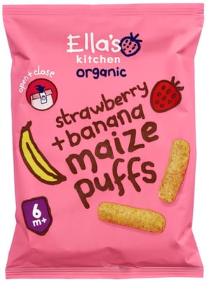 Smakfulle økologiske maispuffer med smak av jordbær + banan. Fingermat som smelter i munnen og passer fint for de minste fra 6 mnd. Posen har en åpne/lukke funksjon som gir lite søl i stelleveksen når du er på farten!