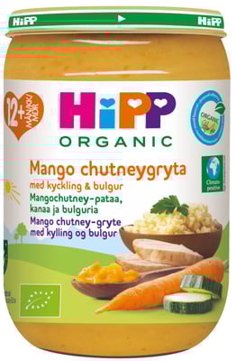 HiPP Mango chutneygryte med kylling & bulgur er et økologisk måltid for barn fra 12 måneder. Oppskriften er utviklet sammen med ernæringseksperter for å sikre at barnet ditt får en komplett sammensatt måltid tilberedt på en skånsom måte. HiPP velger nøye ut de beste økologiske ingrediensene for et godt og smaksrikt måltid. HiPP barnematprodukter er klimapositive. Det betyr at vi gir mer tilbake til naturen enn vi tar, les mer på https://www.hipp.no/