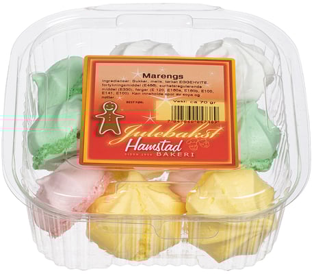 Marengs Hamstad fra Hamstad Bakeri Vekten er 0.08 kg. Produktet inneholder følgende allergener: Egg. Produktet leveres av HAMSTAD BAKERI AS. Produktet ble første gang registrert 11.6.2023 og sist oppdatert 6.9.2023.