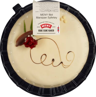 Krem (fløte, sukker, vann, herdet palmekjerneolje, stabilisator (e407, e422, e464, e466), emulgator (e322 soyalecitin, e435, e491), salt, vaniljeekstrakt, aroma, farge (e160a)), kakebunn (hvetemel, sukker, egg, vann, hvetestivelse, hvetegluten, skummet melkepulver, stabilisator (e422), emulgator (e471, e477, e470, e472b, e475), hevemiddel (e450a, e500), salt, farge (e101), aroma (vanillin)), marsipan (sukker, mandler, vann, glukosesirup, invertsukkersirup, maltodekstrin, fuktighetsbevarende middel (e420), stabilisator (e415), konserveringsmiddel (e202)), syltetøy (sukker, bringebær (37 %), vann, fortykningsmiddel (e440), surhetsregulerende middel (e330), konserveringsmiddel (e202)), pynt (sukker, kakaomasse, -smør og -pulver, melkepulver, laktose, dextrose, vann, vegetabilsk olje (raps, palme, palmekjerne, kokos), smørolje (m/melk), sirup, aprikoskjerner, mandler, egg, eggehvite, hvetestivelse, aroma (vanilje, vanillin), mais- og potetstivelse, fruktkonsentrat, glukose sirup, urteekstrakt, gulrot ekstrakt, salt, invertase, maltodekstrin, etanol, konsistensmiddel (e401, e406, e413, e414, e420 (sorbitol), e422, e440a, e441, e450, e471, e476, e492, e901, e904, e322-soya/solsikke), carthamus ekstrakt, fargetistelekstrakt, farge (e100, e120, e131, e132, e133, e141, e150cd, e153, e160abc, e161b, e162, e163, e171, e172, e176), kons. middel (e200, e218, e202), surhetsreg. middel (e304, e306, e330, e331, e336, e340, e524)). inneholder en eller flere typer sukker samt søtstoffer.