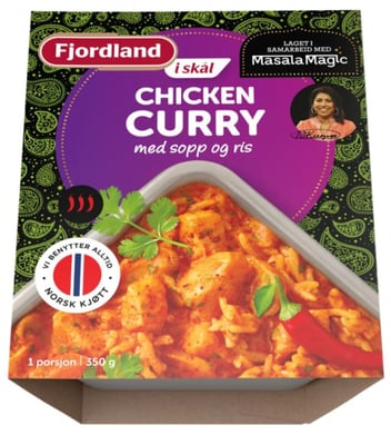 Masalamagic Curry Chicken 350g Fjordland fra Fjordland er et produkt innen Middag, Ferdigmåltider, Ferdigmåltid. Produktet er tilgjengelig hos Meny til en pris av 57.40 kr. Vekten er 350 g. Produktet inneholder følgende allergener: Melk. Produktet leveres av Fjordland as. Produktet ble første gang registrert 15.7.2022 og sist oppdatert 9.9.2023. Prisen har holdt seg stabil på 57.40 kr.