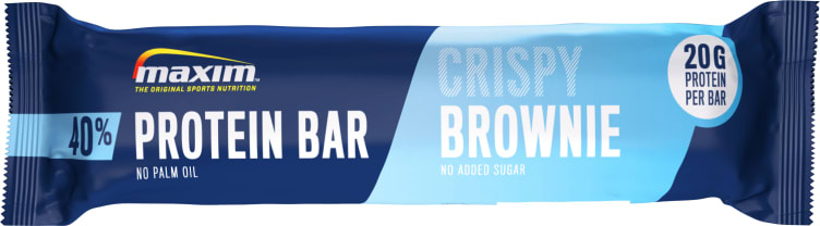 Maxim 40% proteinbar med en digg smak av Crispy Brownie, inneholder 20g protein og kun 1,8g sukker og er bra for deg som lever en aktiv livsstil. Proteinbaren passer perfekt etter en god treningsøkt eller som snacks og mellommåltid i løpet av dagen.