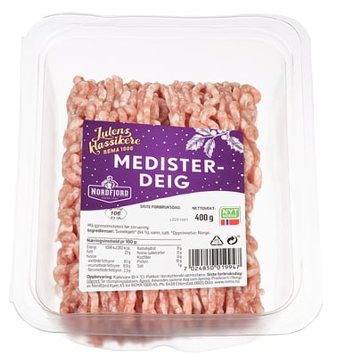 Medisterdeig 400g Vekten er 400 g. Produktet leveres av NORDFJORD KJØTT. Produktet ble første gang registrert 11.6.2023 og sist oppdatert 6.9.2023.