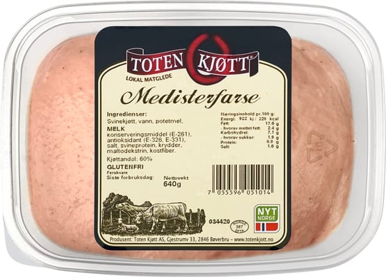 Medisterfarse 640g Toten Kjøtt fra Toten kjøtt Produktet er tilgjengelig hos Meny til en pris av 63.60 kr. Produktet inneholder følgende allergener: Melk. Produktet leveres av Toten kjøtt as. Produktet ble første gang registrert 9.1.2022 og sist oppdatert 16.7.2023. Prisen har endret seg fra 62.00 kr til 63.60 kr over tid.