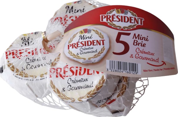 Président Mini Brie er 5 stk Brie á 30 g i et lite praktisk nett. Smaken er mild og blir fyldigere etter som osten modnes. Osten kan nytes sammen med lyst brød og kjeks.