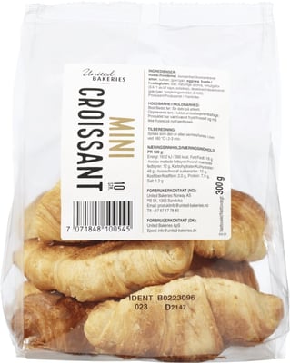 Mini Croissant 10pk 300g United Bakeries fra United bakeries er et produkt innen Bakeri, Boller og småkaker, Croissant. Produktet er tilgjengelig hos Meny til en pris av 44.90 kr. Vekten er 300 g. Produktet inneholder følgende allergener: Egg, Gluten, Melk. Produktet leveres av United bakeries norway. Produktet ble første gang registrert 9.1.2022 og sist oppdatert 6.10.2023. Prisen har holdt seg stabil på 44.90 kr.