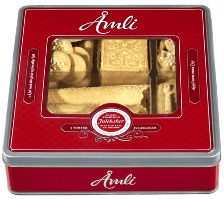 KRUMKAKER: Hvetemel, egg, sukker, klaret meierismør, rapsolje, fløte, melk, vaniljeessens, salt og kardemomme. BERLINERKRANSER Hvetemel, sukker, usaltet meierismør, margarin (rapsolje, fullherdet kokos- og rapsolje, vann, kokosolje, salt, emulgator (mono- og diglyserider av fettsyrer), farge (betakaroten), aroma) og eggeplomme. Emulgator: Soyalecitin. Perlesukker. BORDSTABELS Hvetemel, sukker, usaltet meierismør, margarin , (rapsolje, fullherdet kokos- og rapsolje, vann, kokosolje, salt, emulgator (mono- og diglyserider av fettsyrer), farge (betakaroten), aroma), egg, fløte og vanilje- essens. Emulgator: Soyalecitin. Mandler, melis og eggehvite. GORO Egg, hvetemel, sukker, klaret meierismør, rapsolje, potetmel, fløte, melk, konjakk, vaniljeessens, salt og kardemomme. SERINAKAKER Hvetemel, sukker, usaltet meierismør, margarin (rapsolje, fullherdet kokos- og rapsolje, vann, kokosolje, salt, emulgator (mono- og diglyserider av fettsyrer), farge (betakaroten), aroma), egg, bakepulver, rom-essens, vaniljeessens, soyalecitin. Hakkede mandler, perlesukker