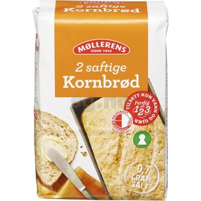 10 poser / KRT Møllerens Saftige Kornbrød er et brød for hele familien og hele Norges bestselger. Sammensetningen av ulike korn- og frøsorter av beste kvalitet gjør at du får to saftige brød med god smak. Trykk her for mer informasjon Oppgi ditt postnum
