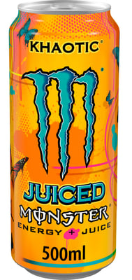 Khaotic skaper kaos på 500ml boks. Det er en kullsyreholdig energidrikk med taurin, L-karnitin, inositol og B-vitaminer. Monster Energy Khaotic er en juiceblanding for å skape en smak som oppleves bedre enn beskrevet. Juiced Monster har en smak som ikke kan sammenlignes med andre energidrikker og inneholder 160mg koffein. Serveres kaldt for maksimal forfriskning.