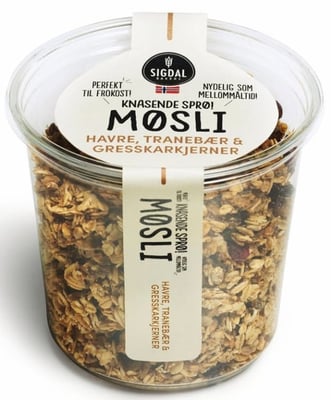 Ristet havre, gresskarkjerner, solsikkefrø og linfrø. Knasende sprø frokostblanding med myke og lett syrlige tranebær.