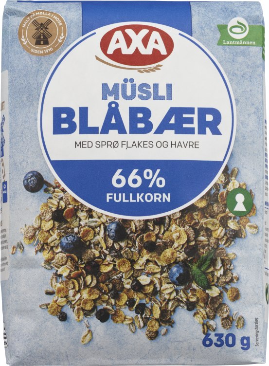 AXA Blåbærmusli er et raskt og smakfult måltid som gir deg energi som varer lenge. Sprø flakes og knasende god havre blandet med en frisk smak av blåbær. Den er Nøkkelhullsmarket og malt ved mølla vår i Moss, samme sted som vi har vært i over 100 år.