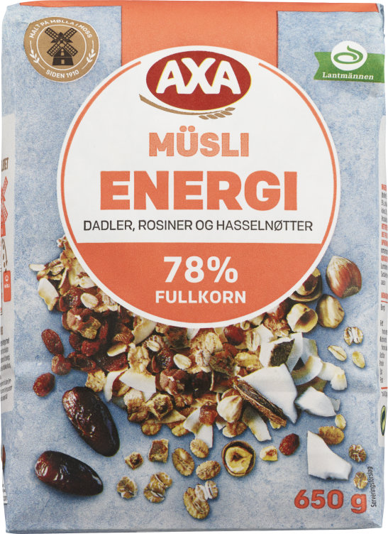 Med AXA Energi musli får du ikke bare et måltid tettpakket med 78% fullkorn og havregryn som gir langvarig energi. Blandet med godsaker som dadler, rosiner og hasselnøtter kan den bidra til å gi deg den ekstra gode starten på dagen. Vår AXA Energi musli er malt ved mølla vår i Moss, samme sted som vi har vært i over 100 år.