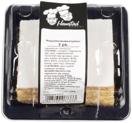 HVETEMEL, margarin (vegetabilsk fett og olje ( SOYA), vann, salt, emulgator E322 soyalecitin, E471, E475, surhetsregulerende middel E330, farge E 160a E 160b og aroma, vann. Fyll: romkrem, FLØTEKREM, vann, sukker, modifisert stivelse, SKUMMETMELKPULVER, vegetabilsk fett, fortykningsmiddel E 401, E 450, rom, farge E 160a, E 150 c), melisglasur (sukker, vann, potetstivelse).
