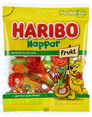 Nappar Frukt 80g Haribo fra Haribo er et produkt innen Snacks & godteri, Godteri. Vekten er 80 g. Produktet leveres av HARIBO LAKRIS AS. Produktet ble første gang registrert 11.6.2023 og sist oppdatert 6.9.2023.