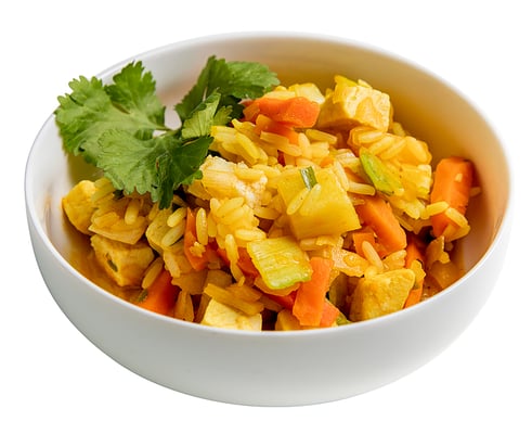 Kokt ris 41 %, kokt kylling 14 % (kyllingbryst, rismel, salt), gulrot, hvitkål, purre, vann, rapsolje, soyasaus (SOYABØNNER, HVETE, salt), salt, gurkemeje, koriander, spiskummin, risstivelse, fennikel, bukkehornsfrø, eddik, cayennepepper, sort pepper, krydderekstrakt (paprika, rosmarin)